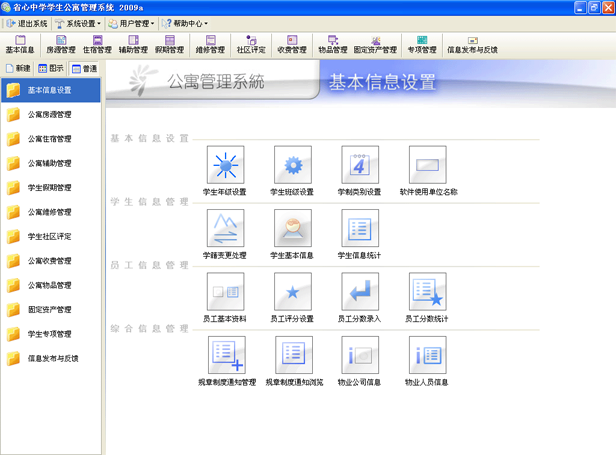 4、基本信息设置 包括学院名称设置、系所名称设置、专业名称设置、学生年级设置、学籍变更处理、学生基本信息、学生信息统计、员工基本资料、员工评分设置、员工分数录入、员工分数统计、物业公司信息、物业人员信息、单位信息设置。